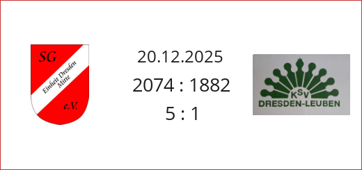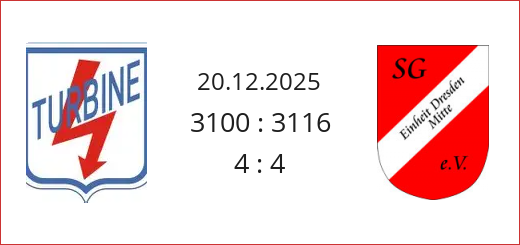 Unser letztes Spiel im Jahre 2025 führte die Mannschaft von Dresden-Leuben in unsere Kegelhalle. Nach dem Hinspielsieg von 6:0 hofften wir, dieses Ergebnis zu wiederholen, da jeder Mannschaftspunkt im Kampf um den Staffelsieg wichtig...